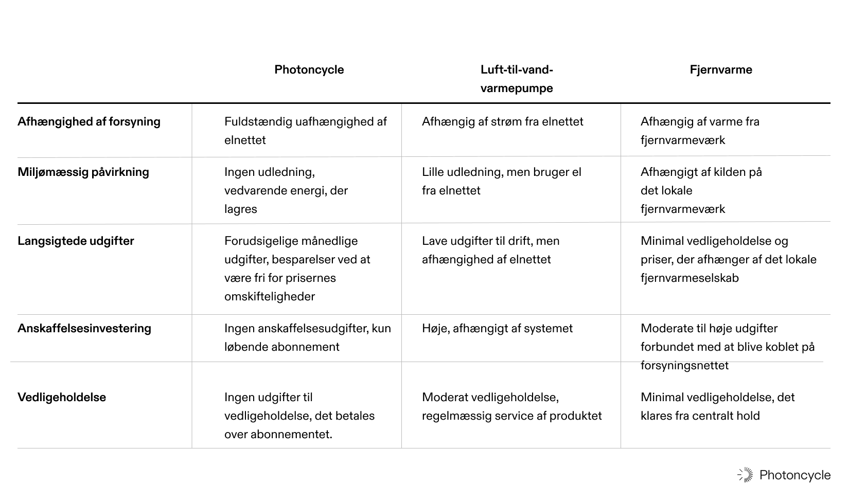 At finde den mest optimale varmekilde afhænger af dit hjem og dine behov. Er uafhængighed af prissvingninger og af elnettet og bæredygtighed de vigtigste faktorer for dig, tilbyder Photoncycle en fremtidssikret løsning, der både sparer dig penge og CO2-udledning. Luft-til-vand-varmepumper er en effektiv varmekilde, der primært bruger vedvarende energi, mens fjernvarme giver dig, der bor de rette steder, varme på en bekvem måde uden besvær.